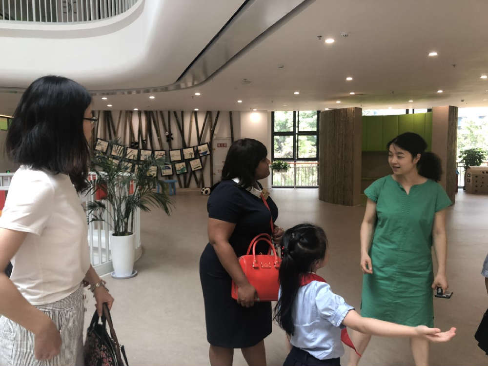 Ms Dorsey Keisha Chante女士一行参观了校园,对学生们活泼可爱的精神面貌赞许有加,在听了两位小导游全程英语讲解后,更是对孩子们的英文水平赞叹不已。