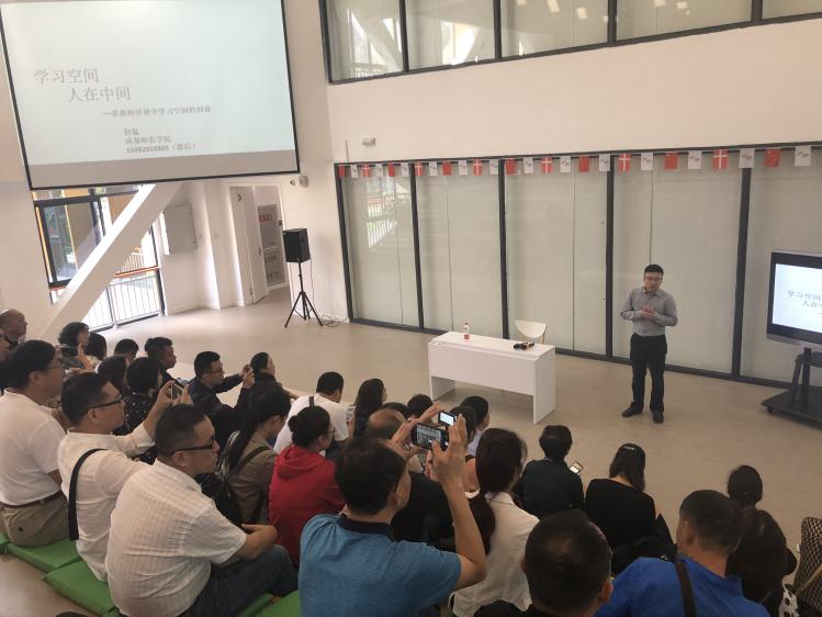 在曾霞校长的带领下,培训班的专家们参观了我校的校园空间建设,曾校长进行了“面向孩子的校园空间再造”的主题分享,结合我校的办学背景、办学理念、建筑形态,从孩子的视角对校园空间再造进行了阐述,专家们纷纷表示,学校的空间设计理念真正地关注到了孩子的成长与发展。随后,成都师范学员徐猛教授针对教师培训中学习空间的创设进行了“学习空间 人在中间”的主题分享,分享中徐教授谈到了教师培训空间的背后是学习方式的转变,培训的打开方式不一样,教师的获得就不一样。