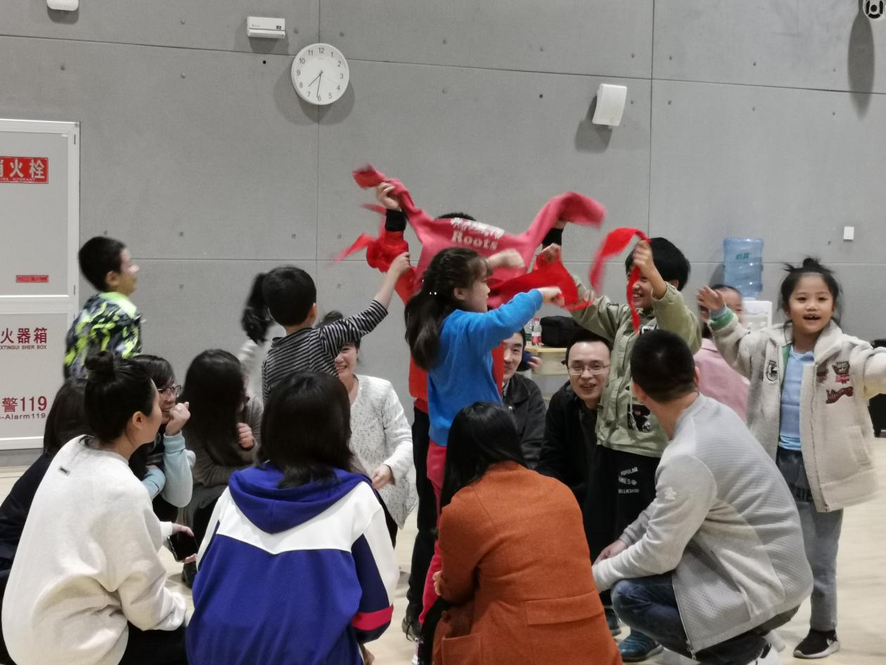 亲子互动游戏在孩子们的热烈期盼中开始了,第一个游戏叫“颜色的秘密”。叶老师首先把现场的所有家庭分为四个小组,各组需在5分钟内商议和创作出一个短剧,把各自得到的颜色通过短剧表演出来。