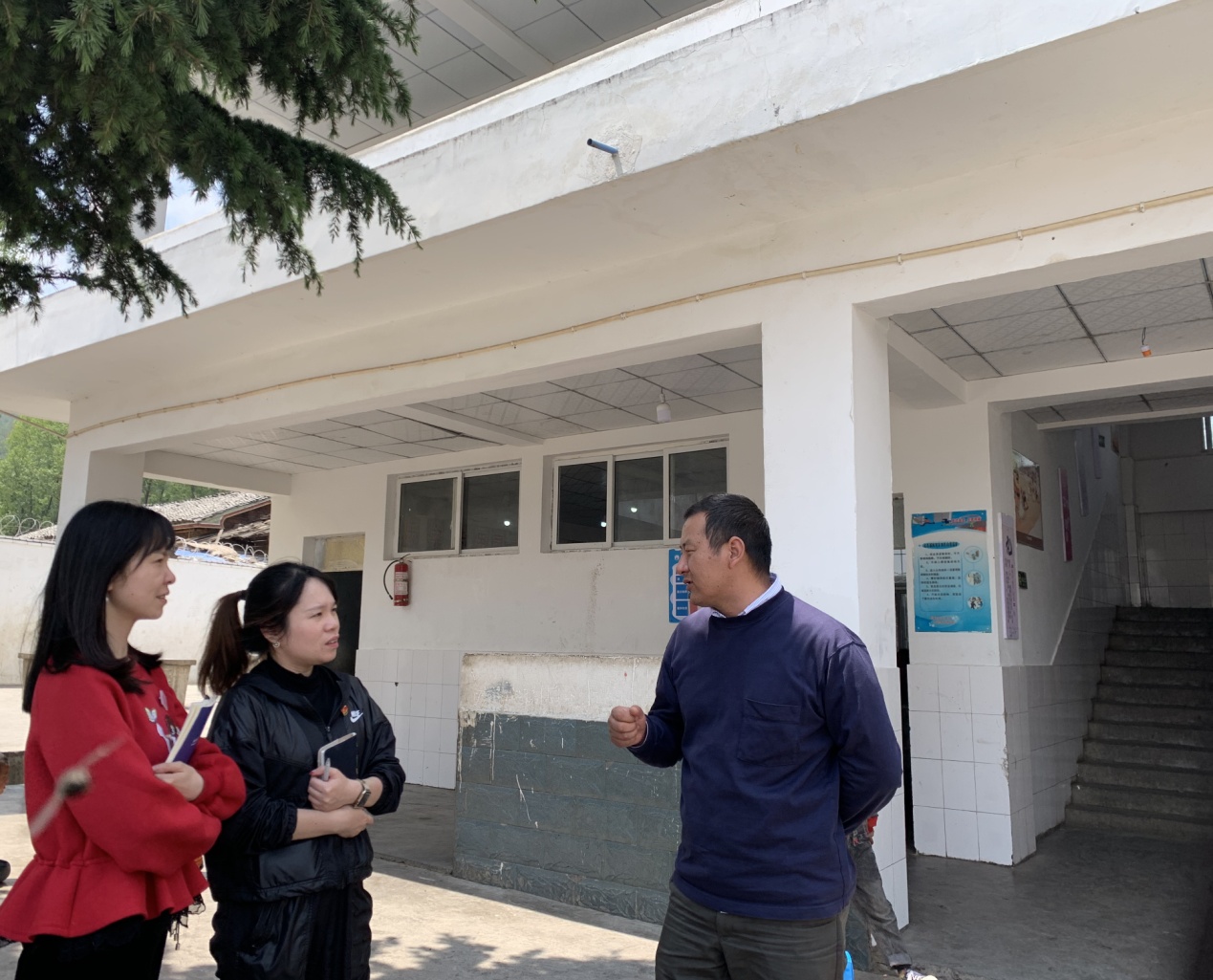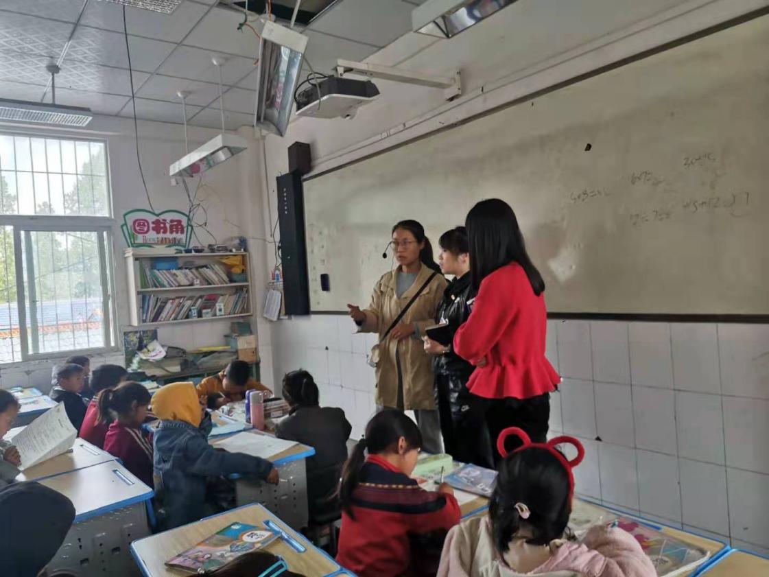 图:许雯雯老师和谷萌老师向大坝中心校副校长了解学校班级管理工作开展情况。