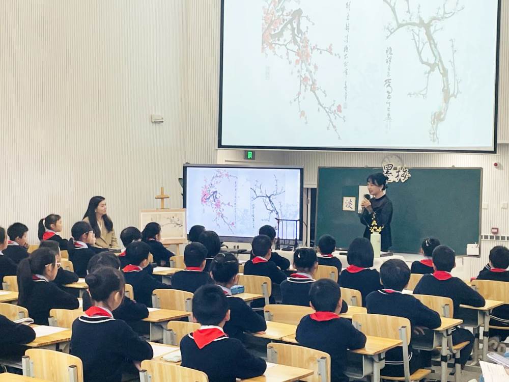第二堂课蒲蕾老师用一系列阅读活动丰满课堂,孩子们在循序渐进中明白王冕不要的“好颜色”其实是权势、名利、地位……课堂最后李老师带着孩子们画梅题字,蒲老师通过引用古人“折梅赠远”的习俗,呼吁孩子们将“墨梅精神”传递给全世界的朋友。