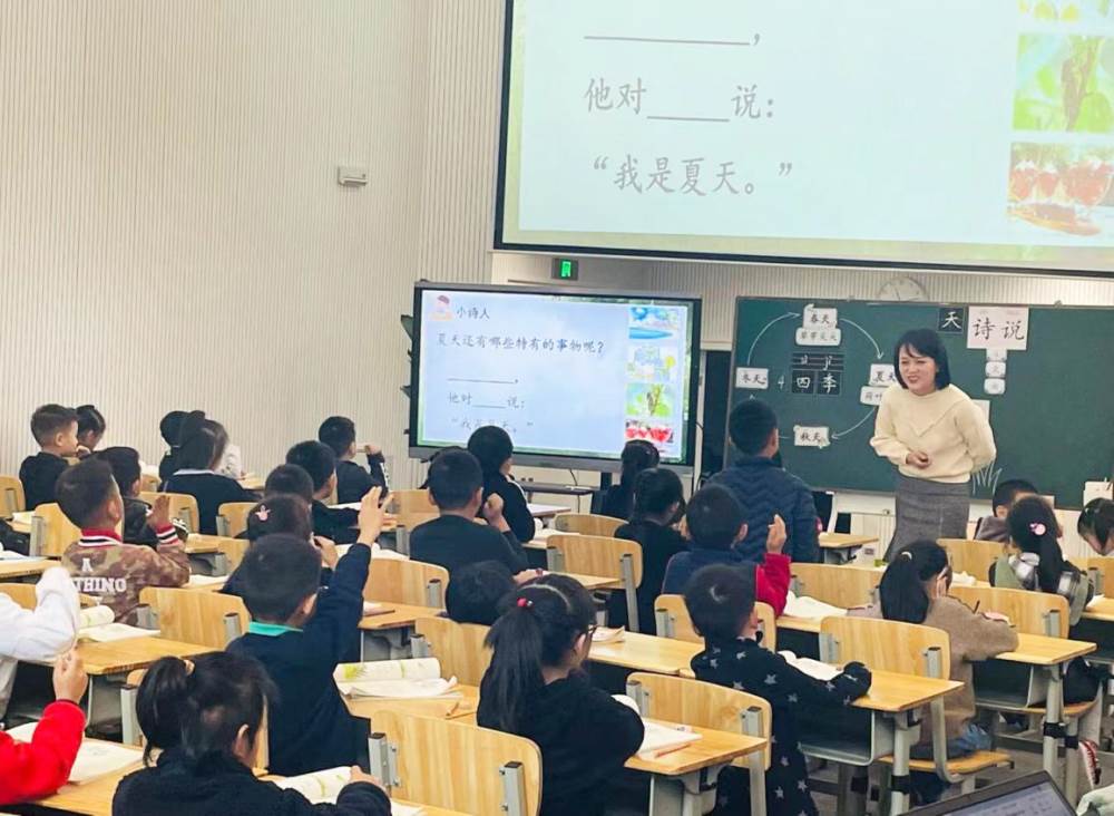 第三堂课我校于晶老师通过前期的校本课程“寻找秋天”引出课题四季,于老师通过师范读,学生展示读,学生齐读等多种形式指导学生朗读诗歌,读出诗歌的节奏和韵味。在教学过程中于老师将随文识字贯穿课堂始终,在诗歌教学愉快的氛围中运用多种方法帮助学生识字、认偏旁,巧妙地解决了识字目标,可谓润物无声。于老师还引导学生挖掘诗歌的语言美,体会用叠词仿写春天和夏天的诗歌。最后,通过快闪游戏识字结束了本课教学,让孩子们意犹未尽。于老师这堂课中将诗歌的教学价值和语文价值充分融合,充分体现了“以诗教”的理念。