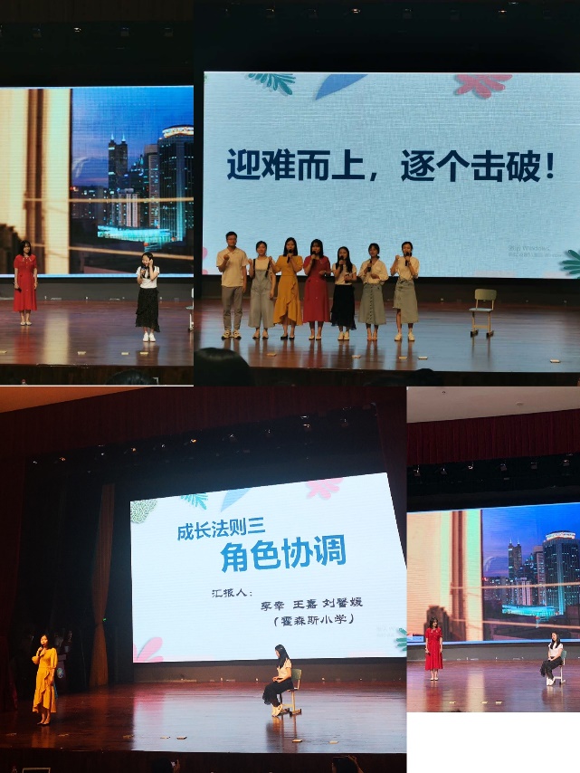 下午的正式汇报中,我们霍森斯小学的新教师代表李幸、刘馨媛和王嘉三位老师围绕《新教师成长法则》为主题,做了情景剧形式的展示汇报了,三位老师克服时间短、任务重的困难,在情景剧中探讨了当生活和工作发生冲突时,如何学会协调,很好的展示了霍小教师团队的专业风采。