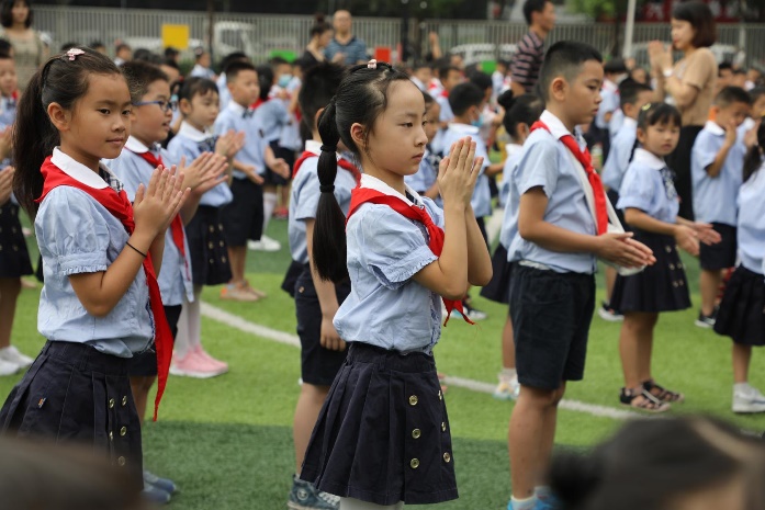 接着,二三年级的孩子对一年级的弟弟妹妹们表示了亲切问候,一声“弟弟妹妹,欢迎你”,拉近了小朋友之间的距离,增强了新生的归属感。典礼结束后,孩子们依次回到教室,继续开学第一课的学习。