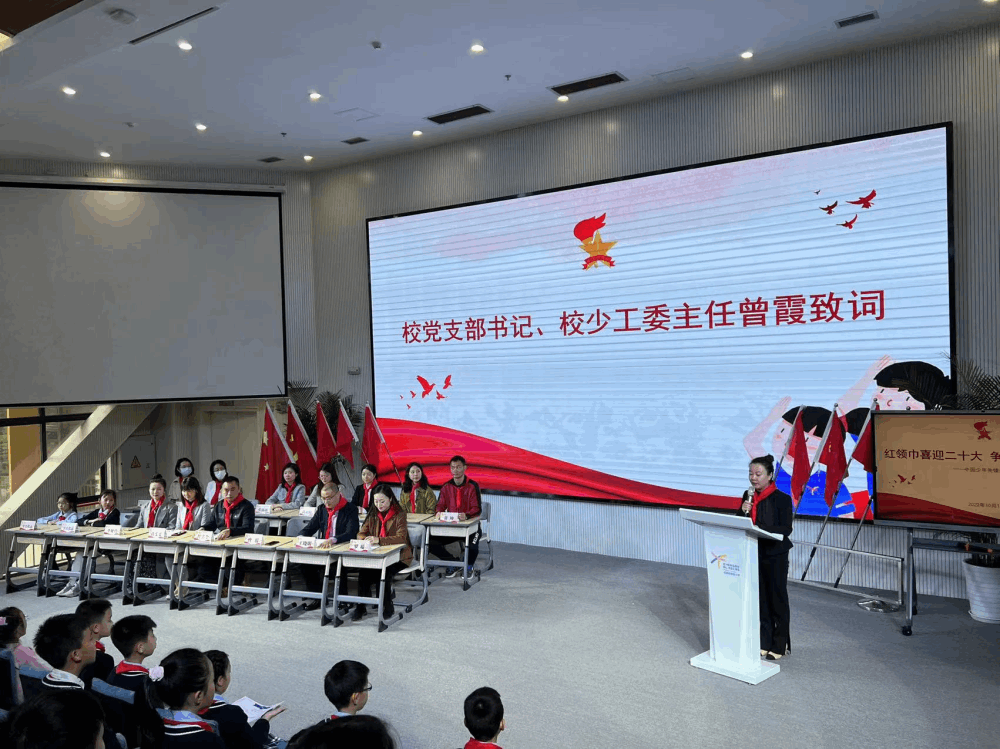 最后校党支部书记、校少工委主任曾霞校长致辞,她希望小代表在学校里要发挥主人翁精神,立下远大志向,乘风破浪向未来,为中国梦作出贡献。